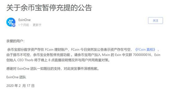 在FCoin暴雷声明发布当天,ExinOne也发布公告,宣布暂停余币宝的充提业务。公告显示,ExinOne余币宝部分数字资产存放在FCoin理财账户。FCoin的突然暴雷,也引发了ExinOne余币宝的暴雷。