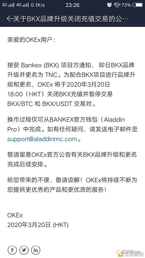 就在3月20号下午5点半左右,OKEX发布了BKX品牌升级公告,紧接着于6点闪电停止了BKX交易,并且投资者只能选择把币提到BKX钱包换成TNC币,已构成变相下架BKX的事实。这让众多投资者大跌眼镜,直呼这就是大平台的风控审核吗,也太儿戏了?!币圈里就算是个再小的平台,要下架某个币,也至少要提前一个星期左右时间通知广大投资人。OKEX作为一个国内投资人熟知的大平台,正常的风控审核都没有,居然在绝大部分投资人不知情的情况下闪电停止交易,强制投资人换币。做到了半小时下架BKX,也真是币圈前无古人,后无来者!