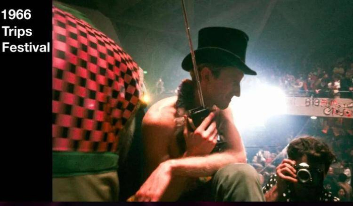 很快他接触到了一个艺术组织,名叫 USCO。这个组织聚集了很多艺术家一起进行全国巡演,并且共同生活了几年。他们的表演方式很特别,不是在舞台上单一地向观众传达信息,而是邀请观众参与进来,布置各种各样奇怪的现场,让艺术家和观众共同体验完成一个作品。USCO 喜欢技术神秘主义理念,同时也深受《控制论》的影响,在工作坊的背景下,推崇跨领域、多学科的协作。比如,他们会引入很多电子技术和工业产品来布置现场,像是闪光灯、投光器、磁带、幻灯片,甚至是迷幻剂、大麻和 LSD。这些小型技术和工具被当作是探索新的生活方式、体验新的精神世界的一种工具。
