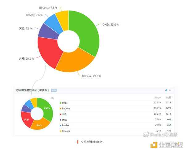 OK、火币和BitCoke这三家交易所是3328名申请者的首选。33.5%的人选用OKEx,23.6%的人选用BitCoke,20.2%的人用火币做交易(不少人在多个交易所都有账户,所以反馈总数接超过5000)。这三家交易所占据了申请者账户的绝大部分市场份额(合计78%)。