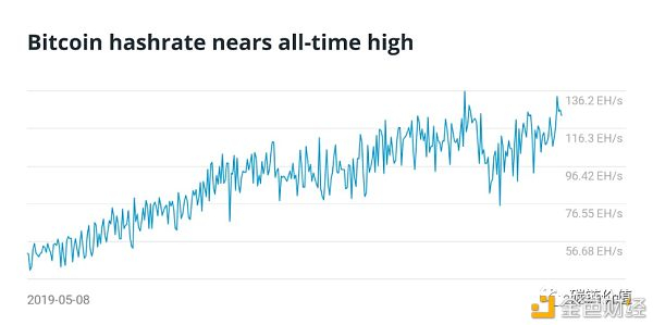 减半后另一个“诱使”比特币价格大幅上涨的原因是市场上卖压减少,这是因为矿工生产的比特币数量会减少50%,因此他们向市场出售的供应量也会减少一半。从历史上看,比特币价格通常会在“减半”后10到11个月才开始出现大幅上涨,这一趋势也抑制了矿工过早抛售比特币的动机。正如Poolin矿池副总裁Alejandro De La Torre所说的那样,目前加密行业里研究人员和专家并不认为比特币区块奖励减半会导致网络算力大幅下降。如下图所示,比特币网络算力接近历史新高。