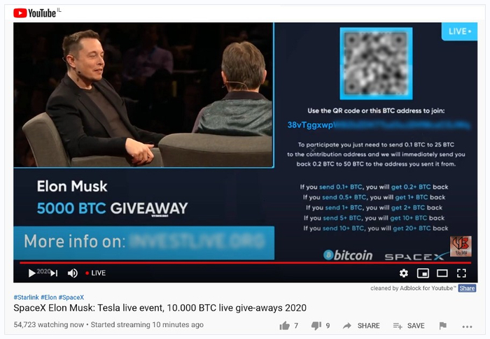使用埃隆·马斯克、Spacex或特斯拉等名字进行比特币诈骗的数量一直在增长。声称埃隆·马斯克赠送5000或10000比特币的骗局视频经常出现在Youtube上。这种骗局的基本模式是,要求人们向他们提供的地址发送比特币,并承诺立即返还,返还的金额是原来的两倍。这个骗局通过埃隆·马斯克的采访视频和Spacex最近的火箭发射来吸引人们。