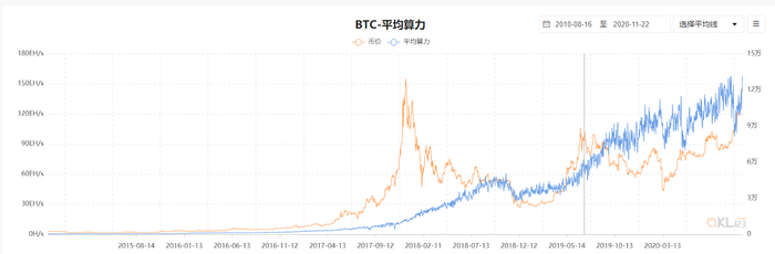 QKL123数据显示,11月22日,比特币的全网算力是157.82E,达到历史至高点。年内涨幅约85%。而原本,因为到了枯水期,此前矿业都预测算力是要暴跌的。157.82E是什么概念?如果加上2020年比特币产量减半的影响,这意味着当前挖矿的比特币产出大约只是年初的30%。不过没关系,比特币在减半后价格也几乎翻倍,正好弥补了产量减半带来的影响。
