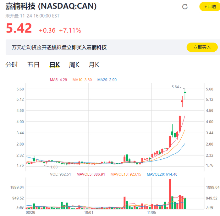 作为矿业第一股,嘉楠科技的股价在11月前长期徘徊在1.85美元左右,但到了11月24日, 其股价为5.42美元,单日涨幅为7.11%。仅仅11月,其股价涨幅就达到了惊人的185%。这涨幅已经超过了比特币。这或许可以一窥美股资本市场对比特币矿业的期待。