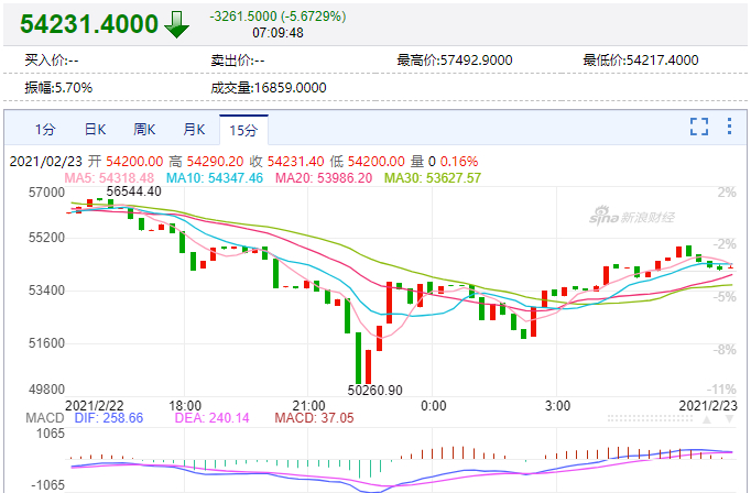 在周一跌破48000美元关口之后,比特币快速反弹,当日已收复54000美元,至北京时间2月23日,比特币一度重回55000美元上方,截至发稿时比特币报54231.4美元/枚。