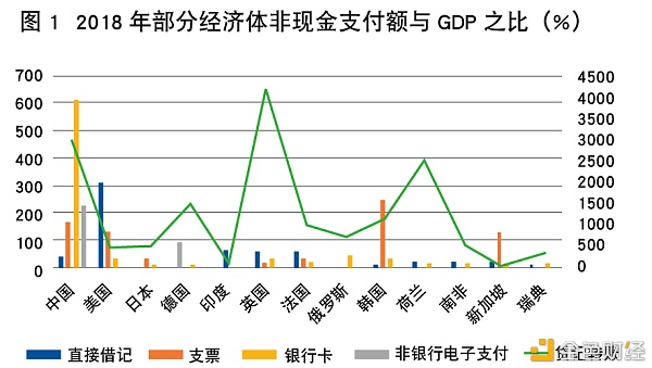 根据国际清算银行(BIS)提供的统计数据,2018年中国的非现金零售支付(包括银行卡和电子现金、支付账户等)额与GDP之比达到了840%,比其他所有经济体同项指标的总和还要高许多。其中,中国的电子货币(非现金零售支付中去除银行卡支付)支付额与GDP之比达231%,其他经济体的同类指标只有1%左右(见图1),电子支付的推广显然不足。