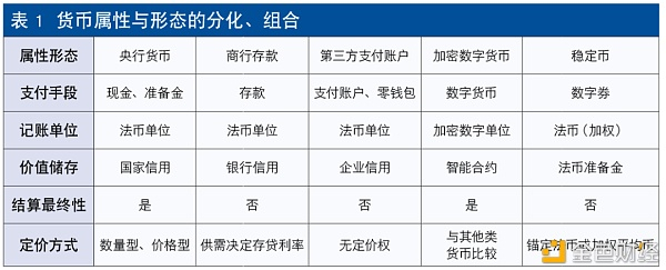 随着互联网的普及、电子商务的蓬勃发展,尤其是智能手机的迅速推广应用,非银行类支付服务机构乘势而上,在“中央银行—商业银行—社会公众”支付链中插入了第三方支付服务。第三方支付机构由于分享了传统上只有银行才具有的资金账户开立、维护等特权,使得电子钱包、预付卡、预存账户大量涌现,从而促进了货币的电子化发展。到这个阶段,货币的“三位一体”功能发生了大的分离(见表1)。支付手段表现为:中央银行现金、存款准备金;银行存款(账户);支付账户、零钱包;民间数字货币;稳定币之数字券款。记账单位主要分为法币、私人加密货币。价值储存功能则相应分为国家信用、银行信用、企业信用、智能合约(非信用)、法币准备金。从结算最终性考察,只有央行货币和比特币是终结性的,即货币的发行人无义务将持有人持有的此类货币兑换成其他资产或锚定物。
