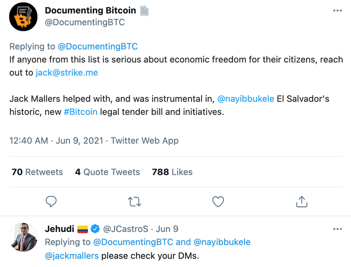 最近,哥伦比亚总统Iván Duque Márquez的数字化转型顾问 Jehudi Castro Sierra 正在与比特币闪电网络钱包ZAP的创始人Jack Mallers进行对话。Jack是萨尔瓦多采用比特币作为法定货币的主要开发商,而ZAP旗下的初创公司Strike,就曾在萨尔瓦多推出比特币闪电支付应用程序。