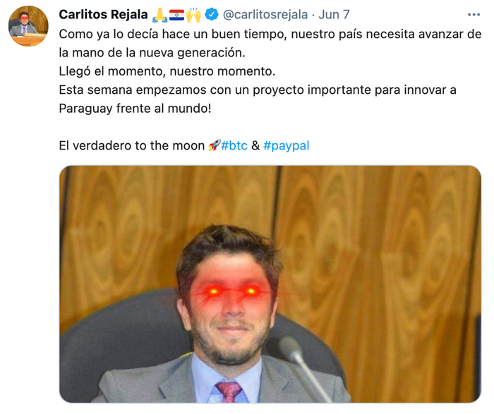 6月7日,巴拉圭众议员Carlitos Rejala在萨尔瓦多宣布将提出一项法案以允许将比特币视为法定货币之后,Rejala 在推特上发布了一张自己的激光眼照片并表示,“正如我很久以前所说的,我们的国家需要与新一代携手前进。我们的时刻到了。本周,我们开始了一个重要的项目,巴拉圭在创新世界面前,真正的起飞!”