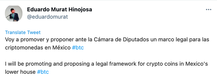 此外,墨西哥联邦政府参议员Eduardo Murat Hinojosa也表示,他将向立法者提交一份“加密货币的法律框架”。在最近的一条推文中,Hinojosa 改变了他的个人资料照片,用标志性的激光眼对着麦克风说话,表示支持加密货币。