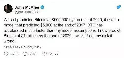 他甚至在2017年预测比特币的价格会涨10倍,在2020年会涨到100万一枚,如果涨不到,他就会.......