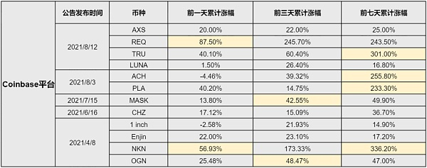 我们以Coinbase 公告发布时间为起点(首次披露),分别向前回溯1天、3天、7天内的累计涨幅,从表格中我们可以看出,REQ/NKN等加密资产在公告前一天便出现了50%以上的涨幅,而像TRU/ACH/PLA等,则在公告发布的三天前便出现了三倍左右的异常大幅上涨,在整体市场环境没有巨变的情况下,这种上涨显得实在有些突兀。