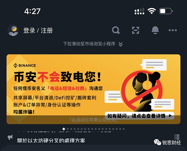 其实在各大交易平台首页皆有类似“谨防新型诈骗”的提醒通知。OKEx通知中便提到了六大诈骗手法:1、账户被封禁,点击陌生网址解封;2、先给您打币,再提币到安全地址;3、交易异常,引导进行账户升级;4、账户有风险,共享屏幕解除风控;5、涉嫌洗钱,有专员帮您解除风险;6、清退某地区用户,升级为海外账户。