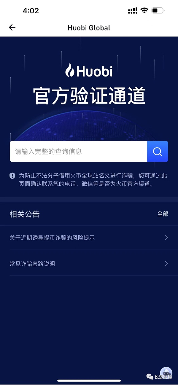 币安也称,“币安不会致电您,任何借币安名义的‘电话、短信、社群’沟通您共享屏幕/平台清退/DeFi挖矿/搬砖套利/账户&订单异常/身份认证等操作均属诈骗。火币全球站还推出了官方验证通道,投资者可通过输入来电号码以查询真假。