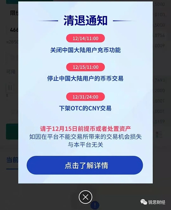 自12月1日起,火币全球站(Huobi Global)平台官网和APP每天都会弹出强制停留5秒的‘清退通知’,以显眼字样注明该交易所清退中国大陆用户的时间线:12月14日11:00,关闭中国大陆用户充币功能;12月15日11:00,停止中国大陆用户的币币交易;12月31日24:00下架OTC的CNY交易。