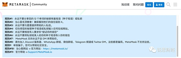 MetaMask社区提示,请勿加入Discord服务器、WhatsApp群组、微信群组、Telegram频道或Twitter DM,这些都是骗局,MetaMask不支持这些。