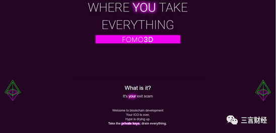 其实比特币就是一个全球范围的经济学和社会学实验。如果Fomo3D的开发者真的在做一场关于人性的实验,那么从各种表现来看,似乎也成立。因为不论是游戏的域名【exitscam.me 逃离骗局】、邀请好友时的提示语【Bad Advices 不好的建议】,还是进入游戏之后的警告【WARNING: THIS PRODUCT IS HIGHLY ADDICTIVE. IF YOU HAVE AN ADDICTIVE NATURE. DO NOT PLAY. 警告:这是一个高度沉迷的产品,如果你具有易沉迷的天性,不要玩】,都明显的暗示这是个骗局,经典的旁氏骗局!