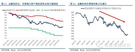 由于金融部门资产负债规模扩张迅速,银行等金融机构首先通过高息揽储展开竞争,抬高利率来吸纳有限的社会储蓄。随后,在存贷比考核、信贷投放行业限制、资本充足率约束背景下,负债端存款占比减少,银行借道表外融资,创造出以非标为代表的结构化理财产品理财,在刚性兑付之下兼顾了高收益和低风险特征,导致社会资金预期收益率中枢持续高企,资产端的低收益和负债端的高成本倒逼金融机构提升风险偏好。2015年存量高收益资产缓慢到期,负债端理财预期收益率终于出现缓慢下行,但远不及资产端收益率降速。