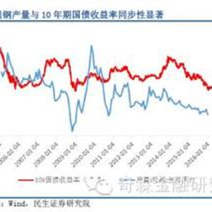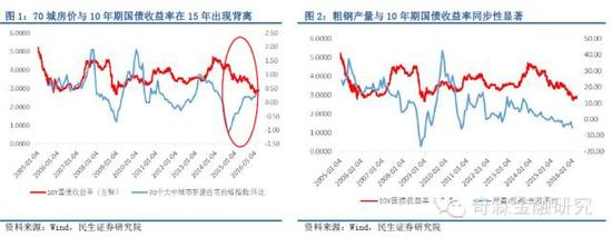 一般而言,70城市房价数据与10年期国债收益率在过去一直保持了正相关关系,且70城市房价数据具有一定领先性,但2015年后,二者则出现持续1年时间的背离,房价上涨的同时10年期国债收益率反而下降。如果再看粗钢产量同比,则与10年期国债收益率也保持了很好的相关性,二者是亦步亦趋的同步指标。