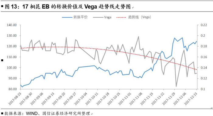 纵向来看,单个债券的Vega值与上述理论表现也较为吻合。以17桐昆EB为例,在其存续期间,转换平价在11月之前较低且在90左右的区间,其Vega值整体维持在较高位置;11月之后,转换平价一路上行,其Vega值也在不断下降。