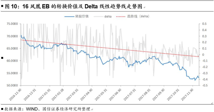 纵向来看,单个债券的Delta值也与理论较为一致。以16凤凰EB为例,在其存续期间,转换平价不断下降,从最初的70左右一路下降至当前的50左右,而其delta中枢也由0.3附近下降到了0左右的水平。