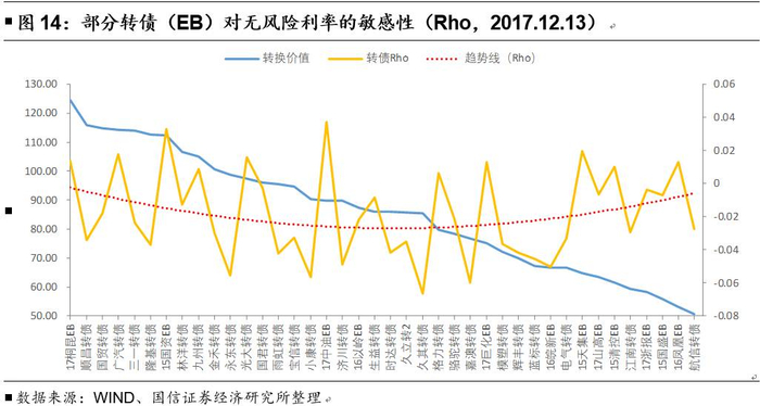 与无风险利率不同的是,转债(EB)价格对相应评级相应期限利率的敏感性相对更高。从12月13日的计算结果来看,Rho1值整体为负且绝对值随着转换平价的下降而上升,这表明当转债(EB)的“股性”较强时,利率对转债(EB)价格的影响较小,其对相应评级相应期限利率的敏感性也较低;而当转债(EB)的“债性”增强时,利率对转债(EB)价格的影响变大,其对相应评级相应期限利率的敏感性也相应增加。