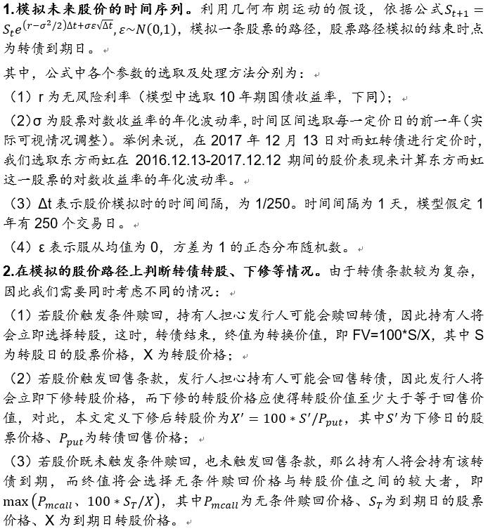 由于需要同时考虑赎回、回售、下修等情况,所以可转债的定价较为繁琐,既不能将各个性质的期权分别加总,也要考虑模型效率而不能过于复杂。因此,本文综合各方面因素对可转债定价的步骤进行梳理,以模拟股价路径为出发点,综合考虑赎回转股、回售下修的情况,进而对可转债准确定价。