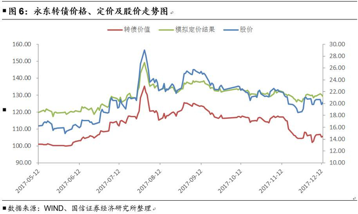 除了模拟定价低于实际价格的情况外,同样也存在着模拟定价持续高于实际价格的情况。以永东转债为例,在转债存续期间,模拟定价持续高于实际价格,整体幅度达到了14.72%左右,我们认为主要原因在于市场对其标的股票的未来表现并不十分乐观。永东股份是一家对煤焦油资源深入研发及应用的高新技术企业,其主营包括三个方面:橡胶用炭黑、煤焦油加工产品和导电炭黑,由此可见,公司主要处于黑色产业链上。尽管供给侧改革于近期推动黑色商品的快速上涨,永东股份也于6-7月出现了上涨,但市场对其后期并不十分乐观,因此永东转债的价格出现了持续低于模拟定价的现象。