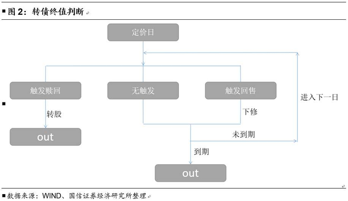 在转债存续期内,每一天都需要判断转债是否触发赎回、回售条款。对于t日,若转债触发赎回,则持有人转股,转债结束;若发生另外两种情况,则转债继续,进入t+1日并继续判断转债是否触发赎回、回售条款。