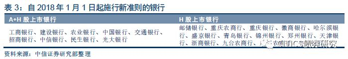 按照财政部“分阶段施行”的原则,在境内外同时上市的企业以及在境外上市并采用国际财务报告准则或企业会计准则编制财务报告的企业,自2018年1月1日起施行新准则。因而,在“A+H”同时上市的银行和在H股单独上市的银行将自2018年1月1日起施行新准则(详见表3);其他境内上市企业自2019年1月1日起施行,即A股上市的银行还有近1年的适应期;执行企业会计准则的非上市企业自2021年1月1日起施行,即对于未上市的银行,还有近3年的适应期。