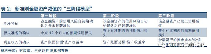 而新准则要求考虑包括前瞻性信息在内的各种可获得信息,使得减值准备反映未来预期的信用损失情况。具体来看,新准则将金融资产分为三个阶段,被业界概括为“三阶段模型”(详见表2)。
