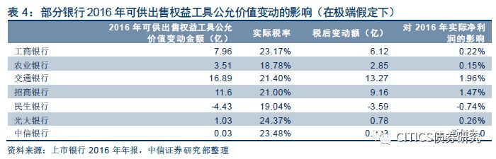 不过总的来说,这一变动对银行影响有限。我们查阅了披露“可供出售权益工具公允价值变动计入其他综合收益总额”这一数据的A+H股上市银行,即使假定这一变动未来全部由其他综合收益转入损益,对当期利润的影响也不会超过2%,有的银行可基本忽略不计(表4)。此外,我们在谈论公允价值变动计入“其他综合收益”或“损益”而产生的差异时,基于一个最基本的假设:会计分期。将时间轴拉长,即使短期在披露上有差异,长期看对企业实质上是没有影响的。