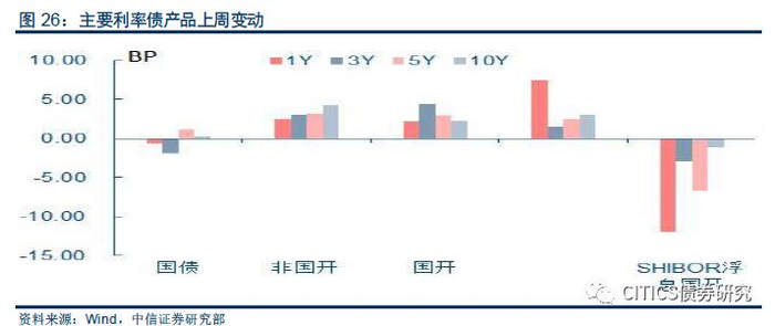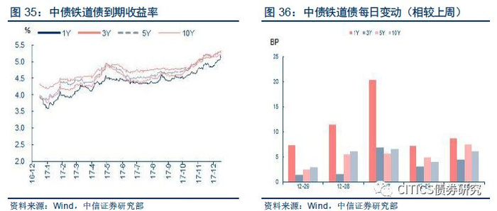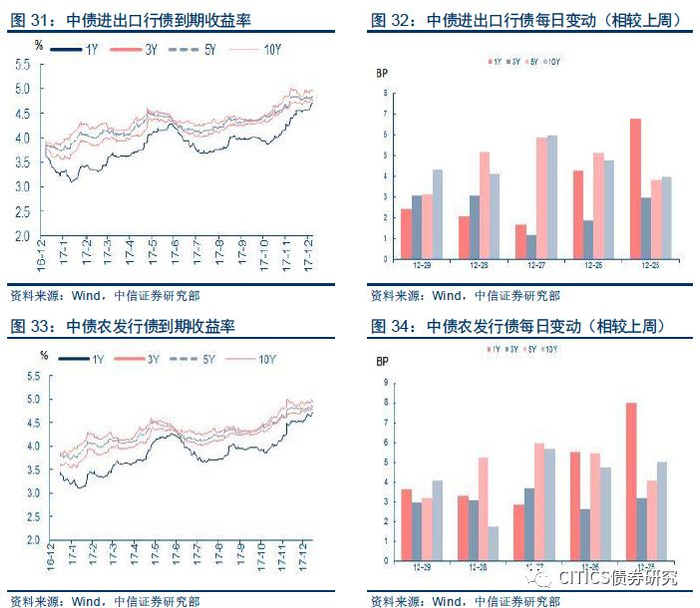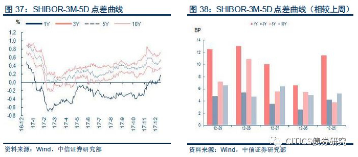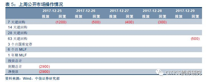 资金面:上周资金利率大体上行。12月29日,DR001加权平均利率为3.59%,较前一周上升97.38BP;DR007加权平均利率为5.42%,较前一周上升2.39BP;DR014加权平均利率为6.67%,较前一周上涨1.23BP;DR1M加权平均利率为6.39%,较前一周上升15.71BP。截至12月29日,SHIBOR方面,隔夜、7天、1个月、3个月分别变动22.8BP、8.70BP、9.50BP、2.25BP至2.84%、2.95%、4.94%、4.91%。