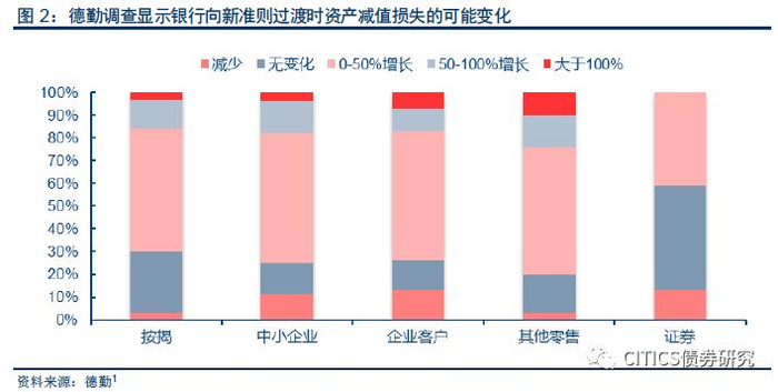 “三阶段模型”对资产价值损失计提的影响是颠覆性的。根据德勤对全球54家银行的调研结果,假设在当前信用环境下,一半以上的银行预计向新准则过渡时,资产减值准备在证券之外的所有类别上增长最高可达50%,有很小比例的银行预计会有超过50%的增长。