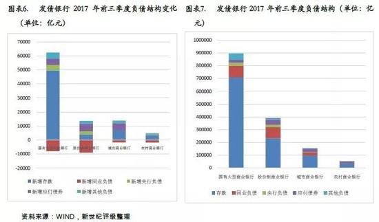 分银行类别来看,大型商业银行业务增速较去年同期略有下滑,股份制银行业务增速下滑降幅最大,且在三季度增速首次低于大型商业银行。主要是股份制银行对同业负债依赖度相对较高,受同业业务监管政策的影响较大。城商行和农商行同样呈现业务增速持续回落趋势。资产占比方面,受资产增速影响,截至2017年9月末,大型商业银行和股份制银行占比较年初分别下降了0.04和0.88个百分点,城商行和农村金融机构占比较年初分别上升了0.20和0.22个百分点。受金融债券、同业存单和央行借款的拉动,截至2017年9月末,我国银行业金融机构负债总额228.26万亿,同比增长10.86%,负债增速较年初下降5.18个百分点。在金融去杠杆的背景下,流动性趋紧,存款增长乏力,存款增速持续放缓。