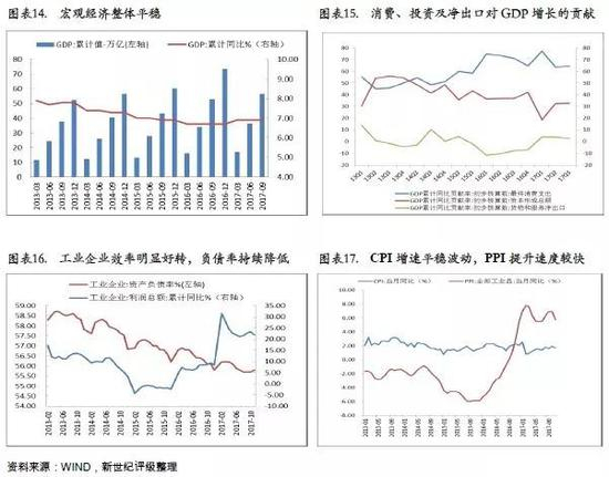 2017年前三季度我国实现国内生产总值59.33万亿元,同比增长6.9%,经济结构呈现积极变化。2017年前三季度,工业生产明显反弹,制造业及消费相关服务业增长较快,金融业与房地产业增速显著回落,受环保限产力度加大和楼市调控力度加强影响,投资增速有所回落。在全球经济复苏带动下,净出口对GDP贡献由负转正。2017年以来,一方面产业结构加快转型升级,高能耗行业全面放缓,战略性新兴产业和高技术产业蓬勃发展;另一方面,供给侧结构性改革推进,重点行业集中度上升,产能利用率提高,企业杠杆率开始下降,盈利能力改善。全国规模以上工业企业实现利润总额累计同比由2016年12月的8.5%上升至2017年11月的21.90%。价格方面,CPI增速平稳,受工业企业补库存和全球大宗商品价格见底回升传导至国内叠加影响,PPI提升速度较快。2017年前11月,我国PPI同比上涨6.4%,为2009年以来的最高值。