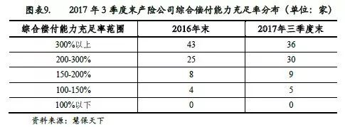 而从前三大产险公司来看,2017年三季度末,人保财险、平安财险、太保财险的综合偿付能力充足率分别为293%、241%和272%,较2016年末分别上升6个百分点、26个百分点和下降24个百分点,整体保持充足稳定。