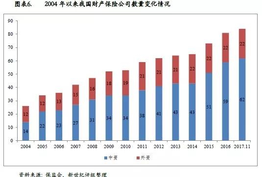 随着监管不断放开,财产保险公司数量持续增长。截至2017年11月末,全行业共有84家产险公司,其中中资产险公司62家,外资产险公司22家,1-11月新增产险公司3家,均为中资产险公司。从市场份额来看,中资财险公司市场份额为98.04%,同比增长0.06个百分点;外资财险公司市场份额则由去年同期的2.01%下降至1.96%。从新设公司来看,监管的逐渐规范和特大型企业抵御外界风险的需求促使自保公司取得发展,2017年1月,中国远洋海运集团有限公司出资成立中远海运财产保险自保有限公司,成为国内第6家自保公司;此外,随着保监会于2015年出台《相互保险组织监管试行办法》,相互保险组织开始逐步在国内试点,2016年6月,众惠财产相互保险社(以下简称“众惠相互”)等三家相互保险组织经保监会批准筹建,2017年2月,众惠相互成为国内首家获批开业的相互保险组织;2017年6月,汇友建工财产相互保险社也获批成立。