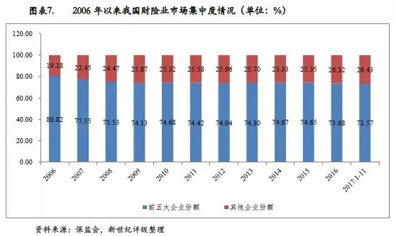 从市场集中度来看,截至2016年末,财产保险业原保费收入排名前五的公司市场份额为73.68%,较2015年末的74.65%略有下降,但相较于2006年的80.82%显著下降。截至2017年11月末,财产保险业原保费收入排名前五的公司市场份额为73.57%,较年初的73.68%下降0.11个百分点,行业集中度下降趋势仍在继续。