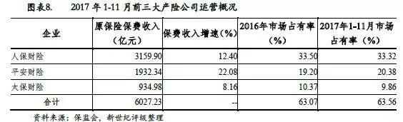 2017年1-11月,前三大产险公司人保财险、平安财险和太保财险的原保险保费收入增速同比均出现回升。其中,得益于非车险业务保费收入的大幅增长(主要源于保证保险业务上年同期基数较低),平安财险保费收入增速同比显著提升;人保财险和太保财险的保费收入增速低于行业平均水平,市场占有率小幅下降,其中,2016年人保财险市场份额小幅提升,而太保财险的市场份额自2014年开始持续下降。得益于平安财险市场份额的提升,2017年1-11月,前三大产险公司市场占有率由2016年的63.07%小幅升至63.56%。