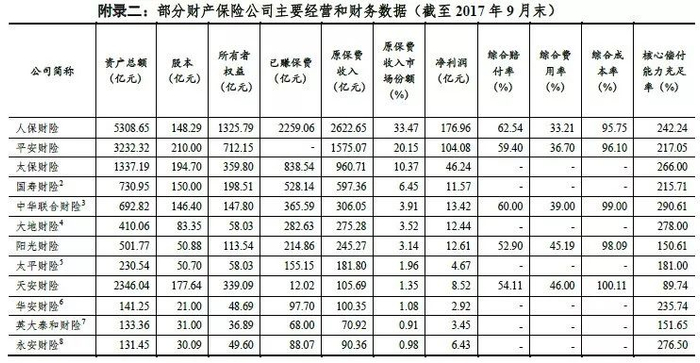 [3]中华联合财险财务数据取自2017年度数据,综合成本率、赔付率和费用率采用1-8月数据,偿付能力数据取自2017年三季度偿付能力报告。