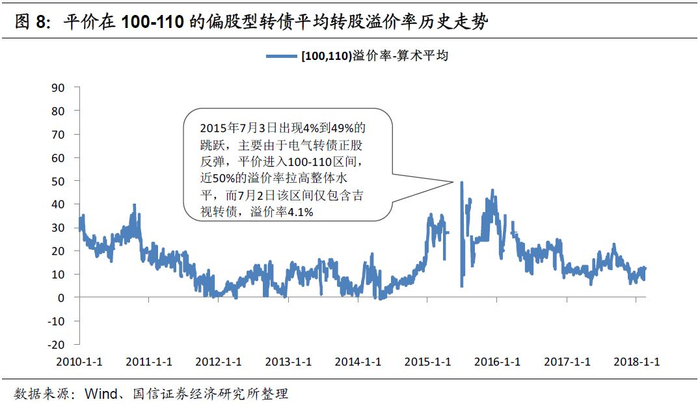 (2)平价在100-110元区间的转债平均转股溢价率历史均值为14.5%,目前在13%附近;