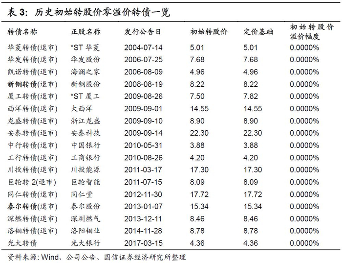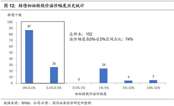 从以往的经验来看,大多数转债发行人在制定初始转股价时倾向于贴近底价设定,历史上57%的转债初始转股价相对定价基础仅上浮0%-0.1%(其中共17只转债底价发行,初始转股价溢价为0,占比11%),17%仅上浮0.1%-0.5%,二者合计占7.4成,较低的初始转股价侧面反映了转债发行人的促转股意愿普遍比较强。