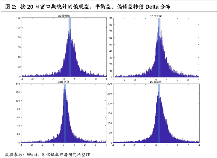 按不同平价水平,我们把历史上的转债分为三组:偏股型(平价在90元以上)、平衡型(平价在70-90元之间)、偏债型(平价在70元以下)。横向来看,转债实际Delta随着平价下降而下降,根据20日窗口期统计的偏股型、平衡型、偏债型转债Delta分布图中心位置逐一左移,均值分别为0.58、0.40、0.21。