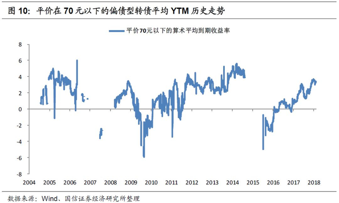 根据“平价在70元以下”的标准筛选偏债型转债,得到2004年以来转债市场平均到期收益率历史数据。
