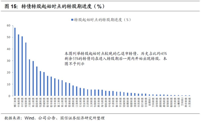 横向来看,大部分转债在进入转股期后短期内便出现首单转股。数据显示,约有55%的转债在进入转股期后一周内持有人陆续开始转股,65%在一个月内开始转股。历史上首单转股出现最晚的是博汇转债,2010年3月进入转股期,直至2012年11月开始转股,背后主要是受到当时国内宏观经济低迷、造纸业景气度下行导致正股基本面薄弱的影响。