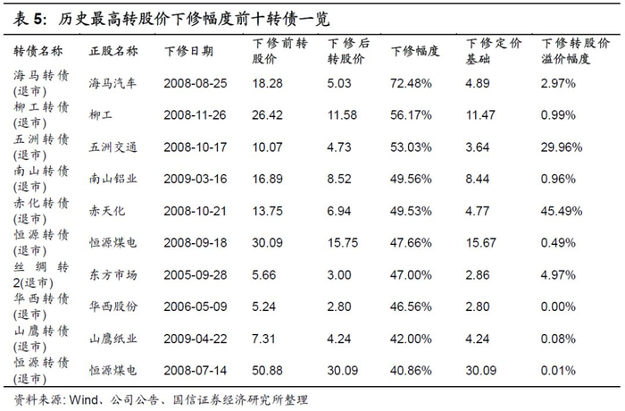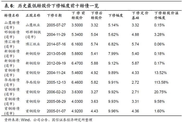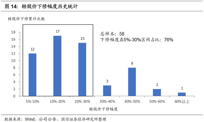 具体来看,总计58次历史下修案例中,12次下修幅度在5%-10%区间、占比21%,17次下修幅度在10%-20%区间、占比29%,15次下修幅度在20%-30%区间、占比26%,3次下修幅度在30%-40%区间、占比5%,8次下修幅度在40%-50%区间、占比14%,2次下修幅度在50%-60%区间、占比3%,1次下修幅度在60%上方、占比2%。