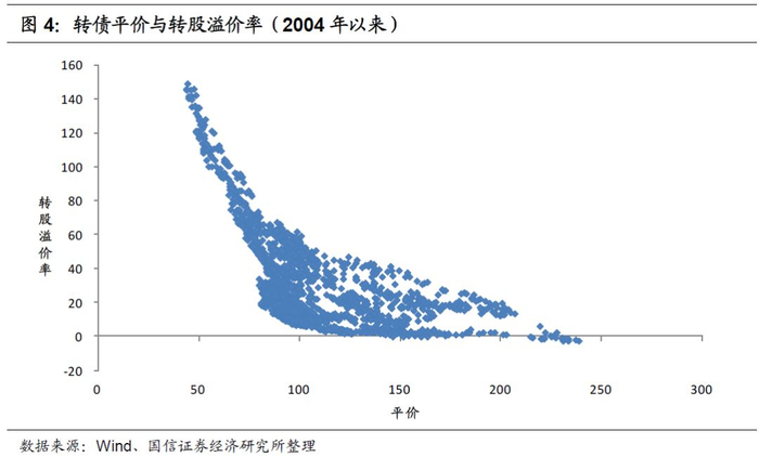 平价和转股溢价率共同决定了转债绝对价格,同时,平价和转股溢价率也存在明显的负相关关系。由于转债设有提前赎回条款,当正股上涨拉高转债平价时,转债估值往往存在下调压力。根据历史数据,当转债平价接近130时,转债转股溢价率便开始压缩,直至0附近,部分平价在200元以上的时期出现负的转股溢价率。
