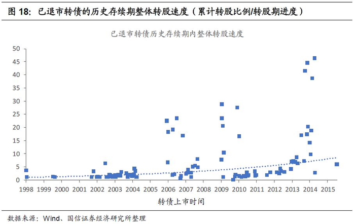 从历史统计中来看,转债存续期内整体转股速度平均为5,假设转债发行期限为6年、转股期为发行6个月后,则转股速度为5意味着进入转股期后平均每周转股约1.9%,在存续期第1.6-2年时完成转股退出。