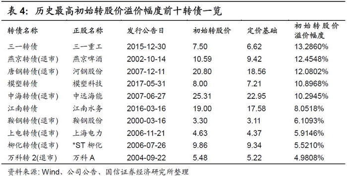 需要提醒的是,这里的“初始转股价溢价幅度”是指转债初始转股价相对募集说明书规定的定价基础的上浮幅度,需注意与转债“初始转股溢价率”的区分。